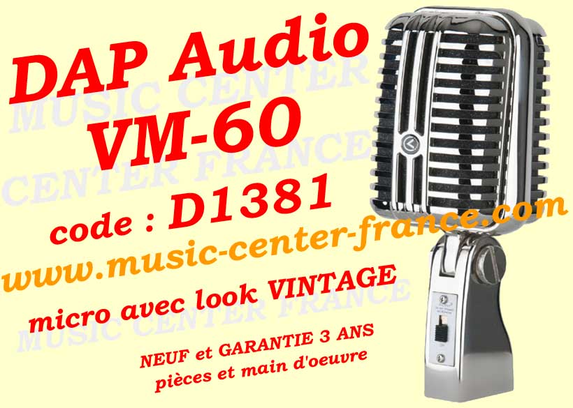 - micro main avec fil DAP Audio VM-60 - VM60 - code DAP : D1381 - look vintage reprenant le style des années 60 - dans le même esprit que les légendaires micros Shure 55SHT2 et Super55 - fabrication dans un alliage lourd et massif permettant une prise en main franche - finition chrome - interrupteur marche/arrêt intégré à la base - embase avec trou fileté pour une fixation directe sans pince sur un pied micro - livré dans une valisette de transport avec mousse antichoc